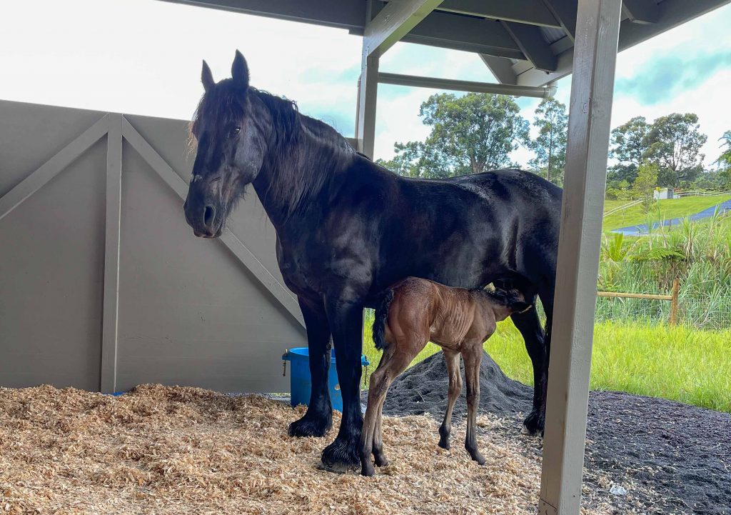 Onyx, a Friesian-Percheron mix, was lying in the middle of his large field while her 11-week-old foal, Uhane, danced around her.