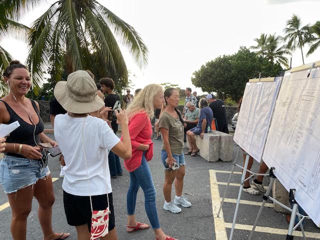 On Thursday evening in the dilapidated parking lot with cracked asphalt and overgrown weeds, officials with Hawai‘i County Parks and Recreation Department met with about 60 community members to explain the renovation plans for the beach park also known as Magic Sands or White Sands — and the preservation and burial treatment plans for Laʻaloa, which is south of the sandy beach.