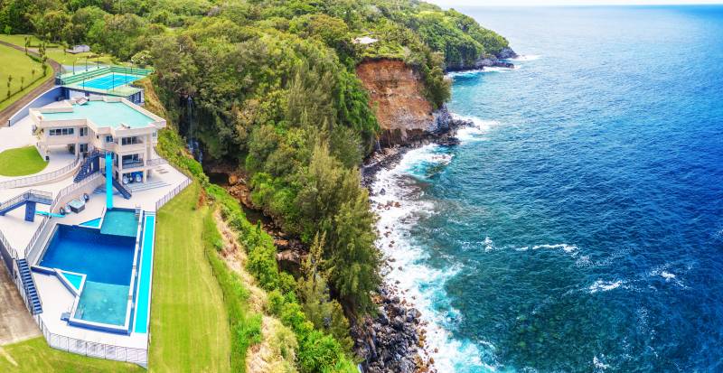 In mid-August, Sotherby Concierge Auction’s put up for auction an 11,000-square-foot, 5-bedroom mansion perched atop a cliff overlooking the Pacific Ocean on the Big Island’s Hamakua Coast.