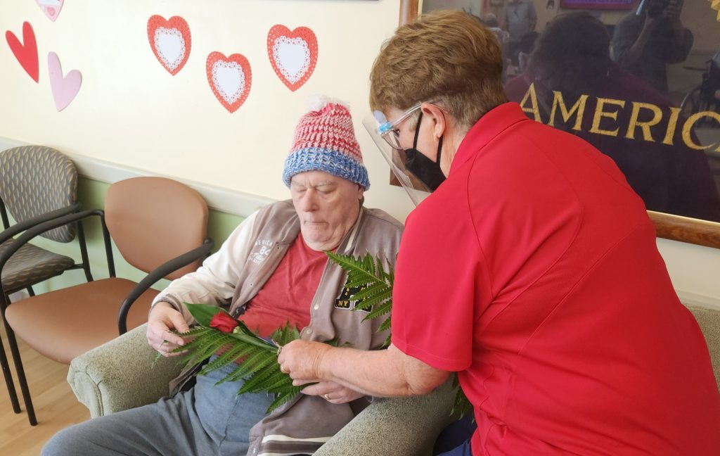 The veterans smiled as they received the roses and took part in other Valentine’s activities, including “love bingo” karaoke and being treated to cupcakes from the Veterans of Foreign Wars and waffles made by staff.