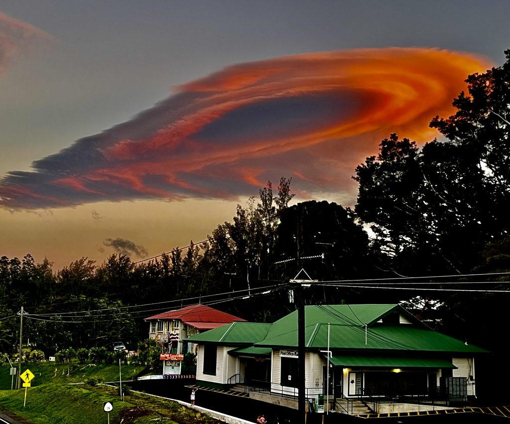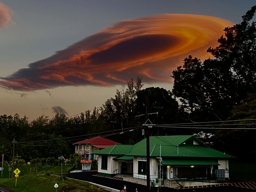 “The winds are pumping this morning!” the Volcano Art Center said in a post sharing a photo of one of the clouds hanging out over its gallery in Hawai‘i Volcanoes National Park. “And this space ship cloud is ready to abduct the Volcano Art Center staff!”