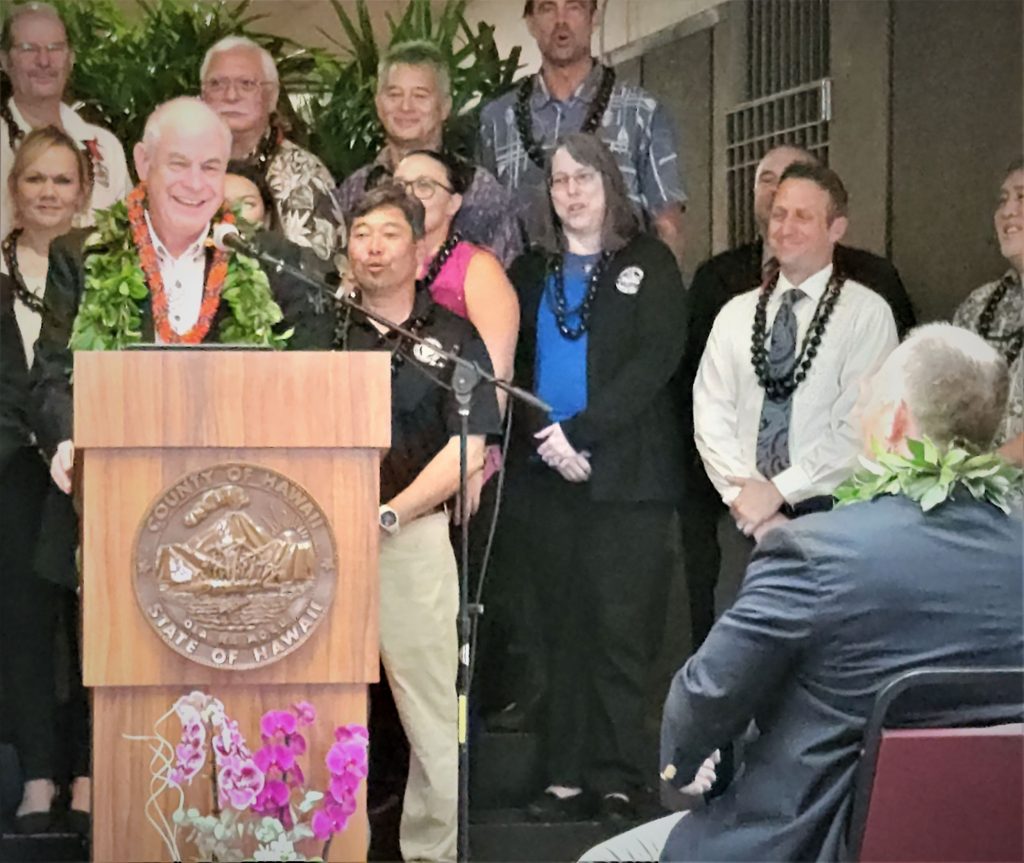 “Since Day 1, our priority has been and will continue to be sustainability,” he said with County department chiefs backdropping him at a podium in the atrium of the County Building in Hilo.