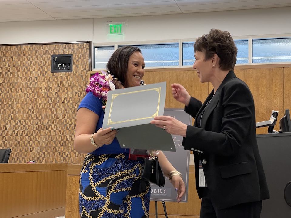 Chaniece Estoy-Keka, who completed the program in 1 year and 8 months, was joined by three of her sisters in the courtroom and one who watched the event virtually. Her eldest sister, Christine Roney, said her sister’s journey to sobriety was a long time coming, and the transformation has been amazing.