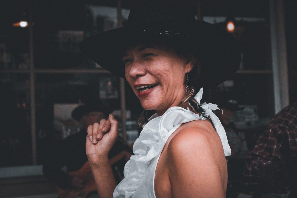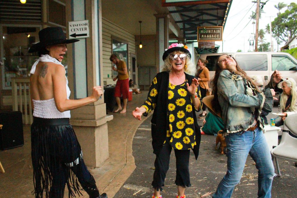 • Michelle Hartman, president of the Honoka’a Business Association, dances during the annual cowboy talk story session in Honoka’a for Western Week on May 22, 2023. (Megan Moseley/Big Island Now)