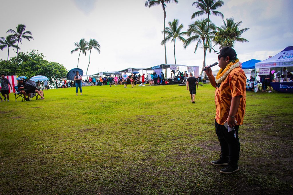 The host of the 19th Annual Celebration of Life ceremony by Hawai’i Care Choices speaks to the crowd during the rain on Sunday. Photographed on May 28, 2023. (Megan Moseley/Big Island Now).