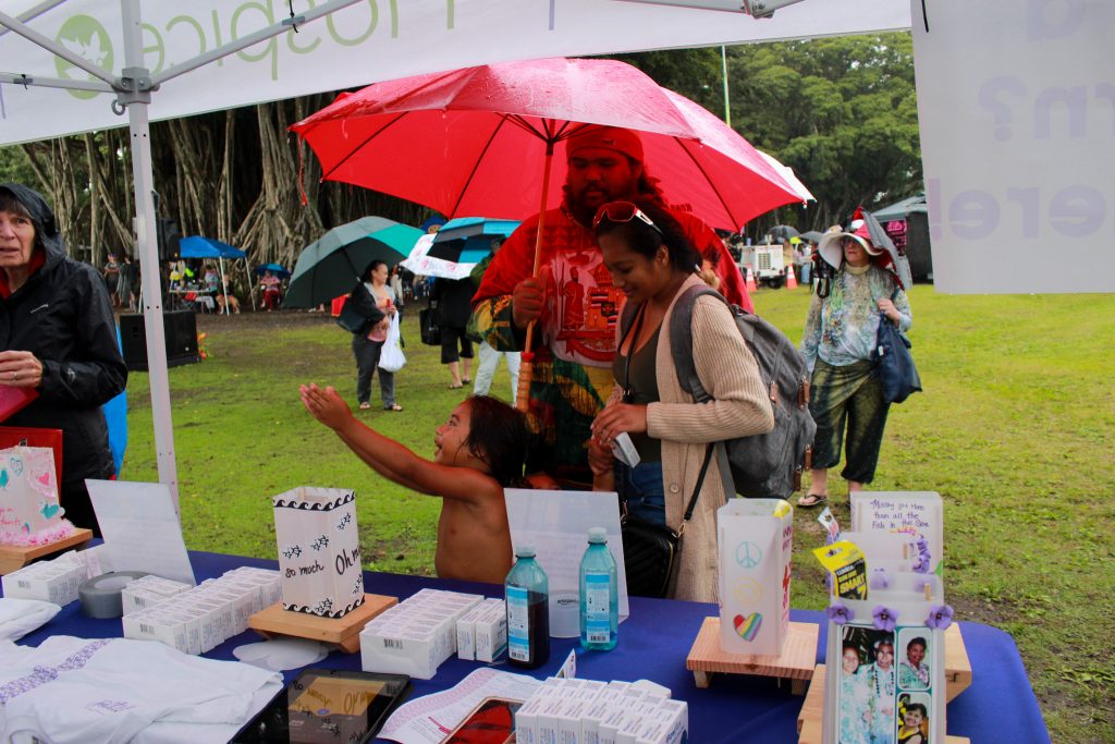 A local keiki reaches up to capture the rain during the 19th Annual Celebration of Life ceremony hosted by Hawai’i Care Choices Photographed on May 28, 2023. (Megan Moseley/Big Island Now).