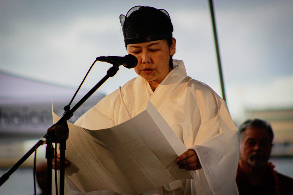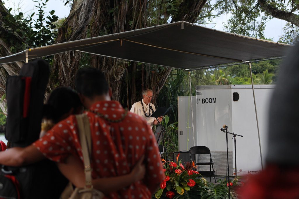 A guest speaker presents a prayer during the 19th Annual Celebration of Life ceremony hosted by Hawai’i Care Choices on Sunday. Photographed on May 28, 2023. (Megan Moseley/Big Island Now).