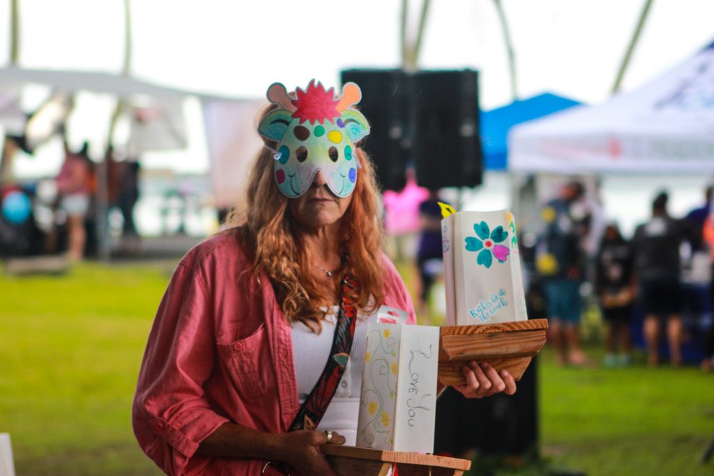 A participant in the 19th Annual Celebration of Life ceremony at Reeds Bay Park in Hilo walks past the stage on Sunday. Photographed on May 28, 2023. Hawai’i Care Choices hosted the event. (Megan Moseley/Big Island Now).
