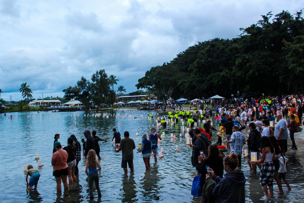More than 1,000 floating lanterns in honor of passed loved ones filled Reeds Bay Beach Park in Hilo Sunday evening for the 19th Annual Celebration of Life ceremony. Photographed on May 28, 2023. (Megan Moseley/Big Island Now).