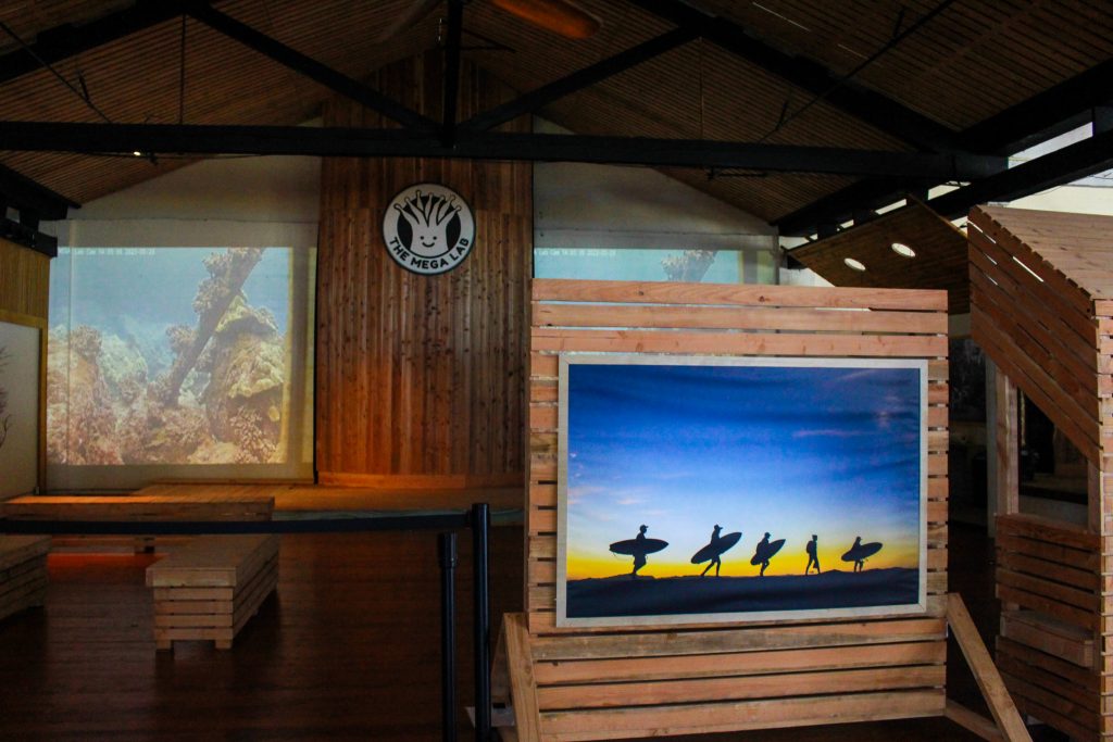 It shows microplastics and tons of fishing nets, which act like a bulldozer over the reef. There are small displays about what mother birds try to feed their young, raising awareness about the need to protect this area and reflect on the human impact on the natural world.