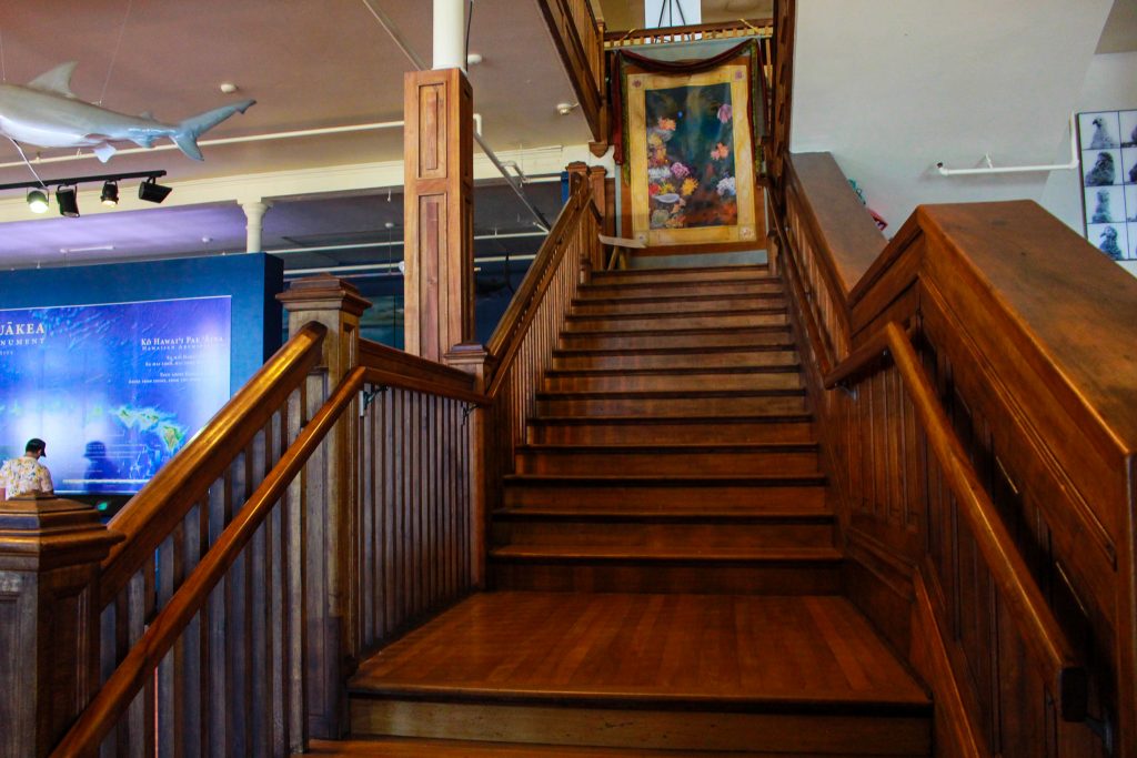 The 3,500 gallon saltwater aquarium houses fish from the protected monument area. There are large maps and videos of the marine area, as well as recovered items from old shipwrecks and an extensive mural by Hawai’i artist Kahi Ching’s interpretation of the kumulipo, Hawaiian creation chant.