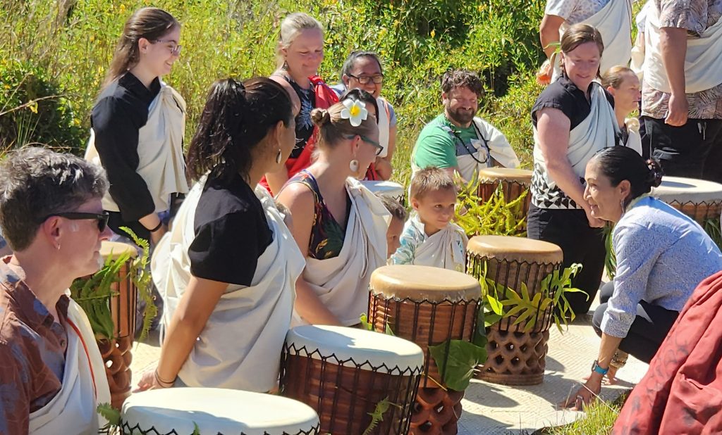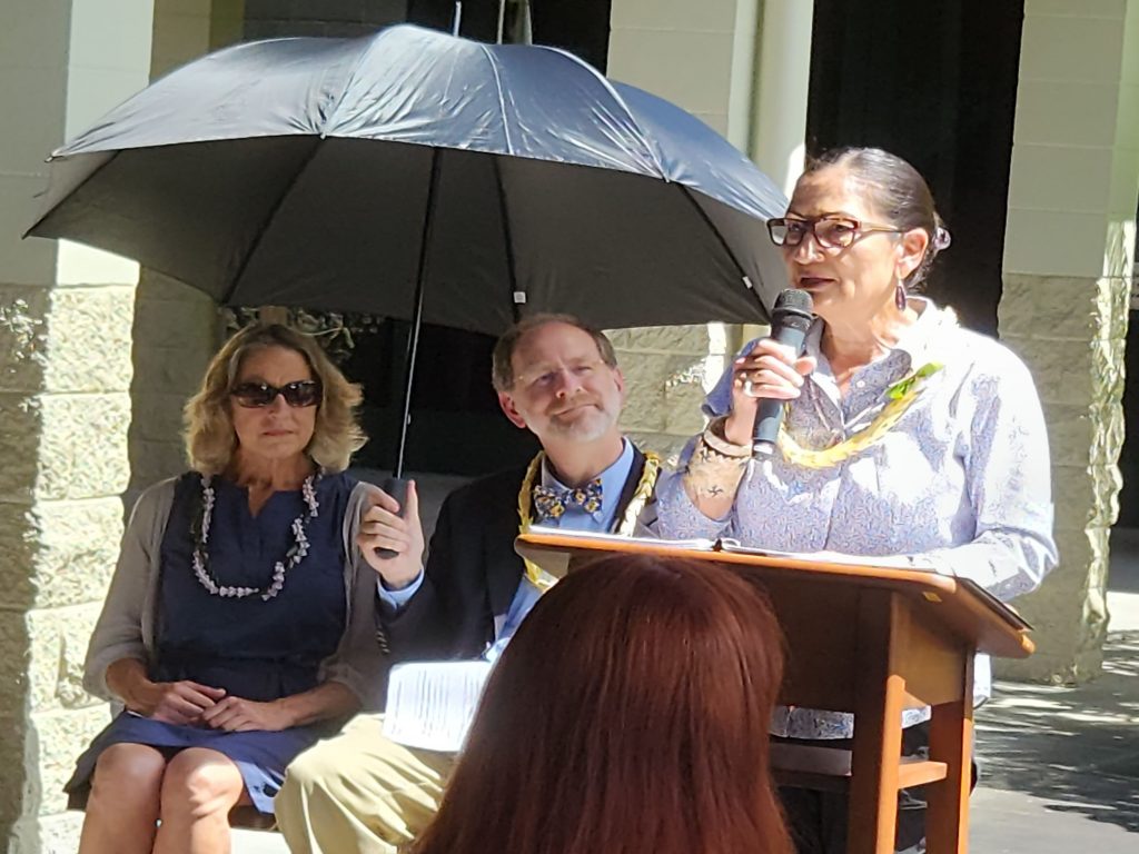 While the crowd watched in silence during the kīpaepae, or traditional Hawaiian welcoming ceremony, the ‘āina (land) embraced them. A bright blue sky, lush greenery, singing birds and an occasional dragonfly zooming by provided the stage for chants, music and hula led by Tagab-Cruz.