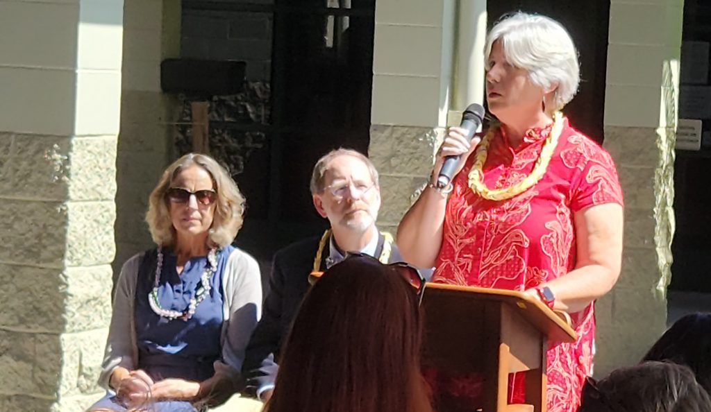 • University of Hawai’i Chancellor Bonnie Irwin gives remarks Wednesday during the ground blessing ceremony for the new U.S. Geological Survey research facility in Hilo that will house the Hawaiian Volcano Observatory and Pacific Island Ecosystems Research Center in Hilo. (Photo by Nathan Christophel/Big Island Now)