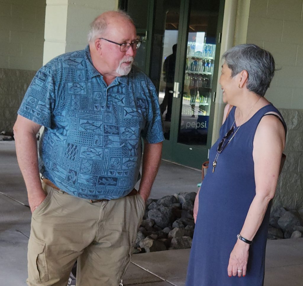• Hawaiian Volcano Observatory Scientist-In-Charge Ken Hon speaks with a member of the community Wednesday following the ground blessing ceremony for the new U.S. Geological Survey research facility that will house the observatory and Pacific Island Ecosystems Research Center on the University of Hawai’i in Hilo campus in Hilo on the Big Island. (Photo by Nathan Christophel/Big Island Now)