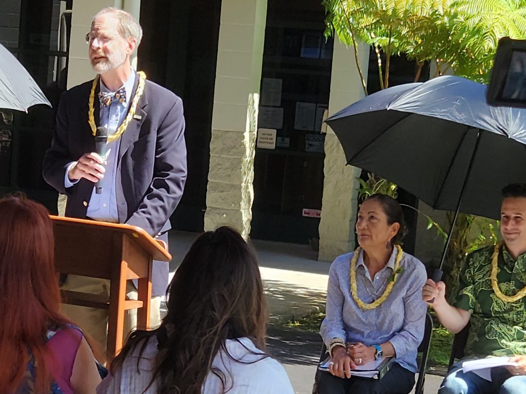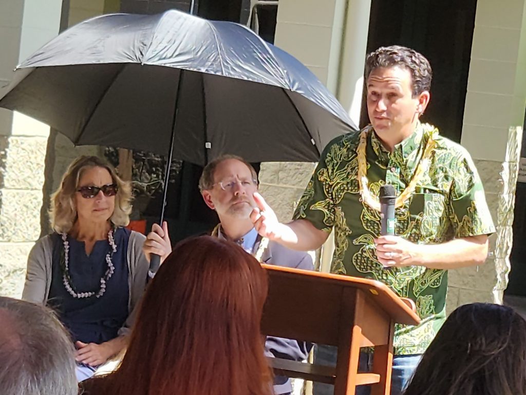 • U.S. Geological Survey Director David Applegate gives remarks Wednesday as U.S. Secretary of the Interior Deb Haaland and U.S. Sen. Brian Schatz of Hawai’i listen during the ground blessing ceremony for the new U.S. Geological Survey research facility in Hilo that will house the Hawaiian Volcano Observatory and Pacific Island Ecosystems Research Center in Hilo. (Photo by Nathan Christophel/Big Island Now)