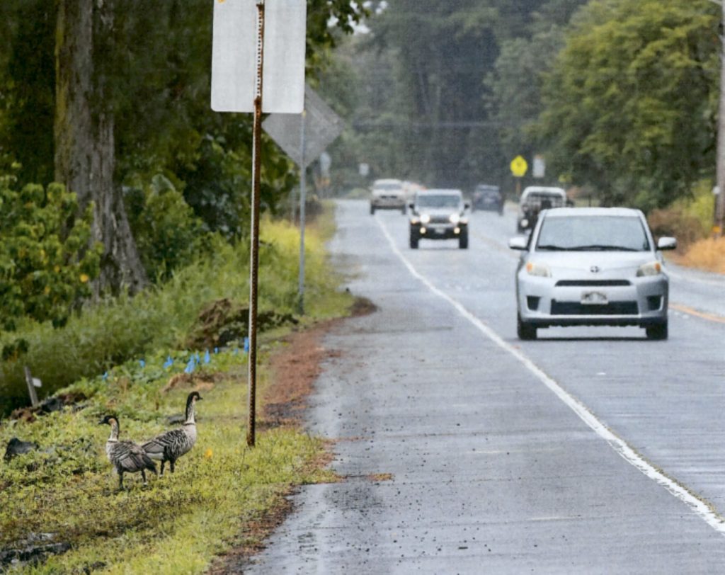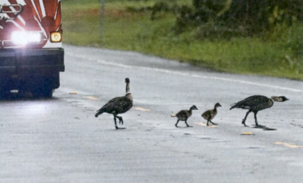 Nēnē often pop up from an embankment along the roadway, giving drivers little time to react.