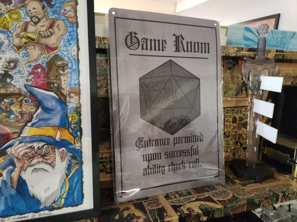 • A sign asks players to roll for an ability check to enter the game room at Gam3Escape in Hilo. (Nathan Christophel/Big Island Now)