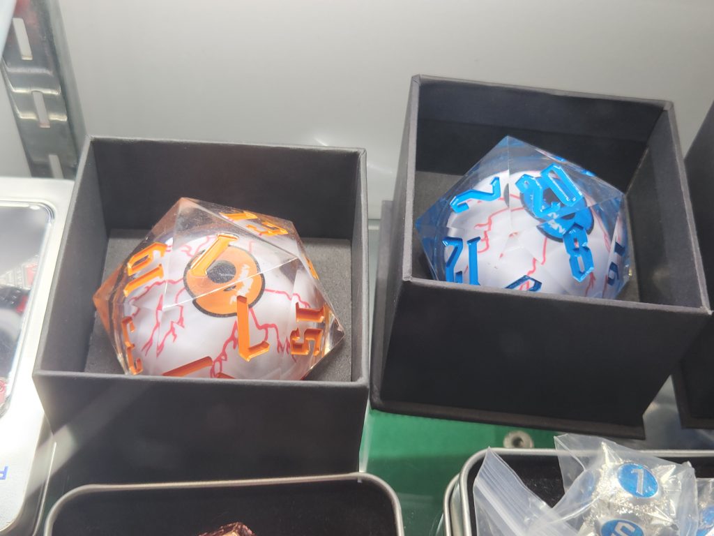 • Eyeballs in the center of two 20-sided dice stare back at customers from a display case at Gam3Escape in Hilo. (Nathan Christophel/Big Island Now)