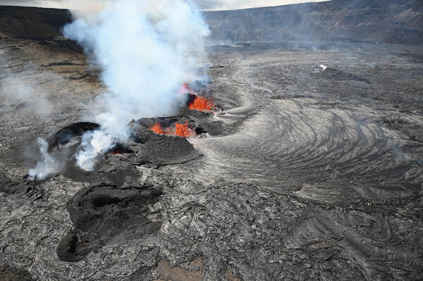 On Saturday morning, HVO field crews reported that active lava was no longer flowing onto Halemaʻumaʻu crater floor and was restricted to a ponded area north of the vents on the downdropped block.