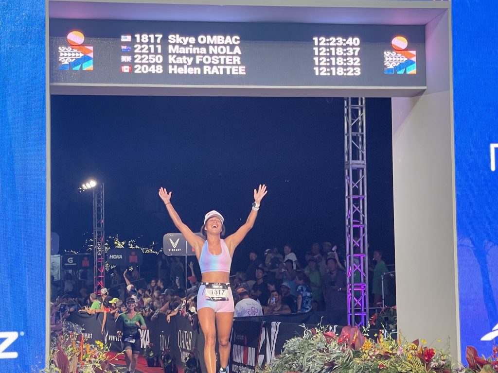 Hawai‘i’s youngest triathlete in the race, Skye Ombac, 27, of Hilo, finished her second Ironman World Championship in 12:23:40, also beating her 2022 time by an hour. She crossed the finish line with her arms stretched to the sky and a smile on her face. She ranked 96th in her age group.