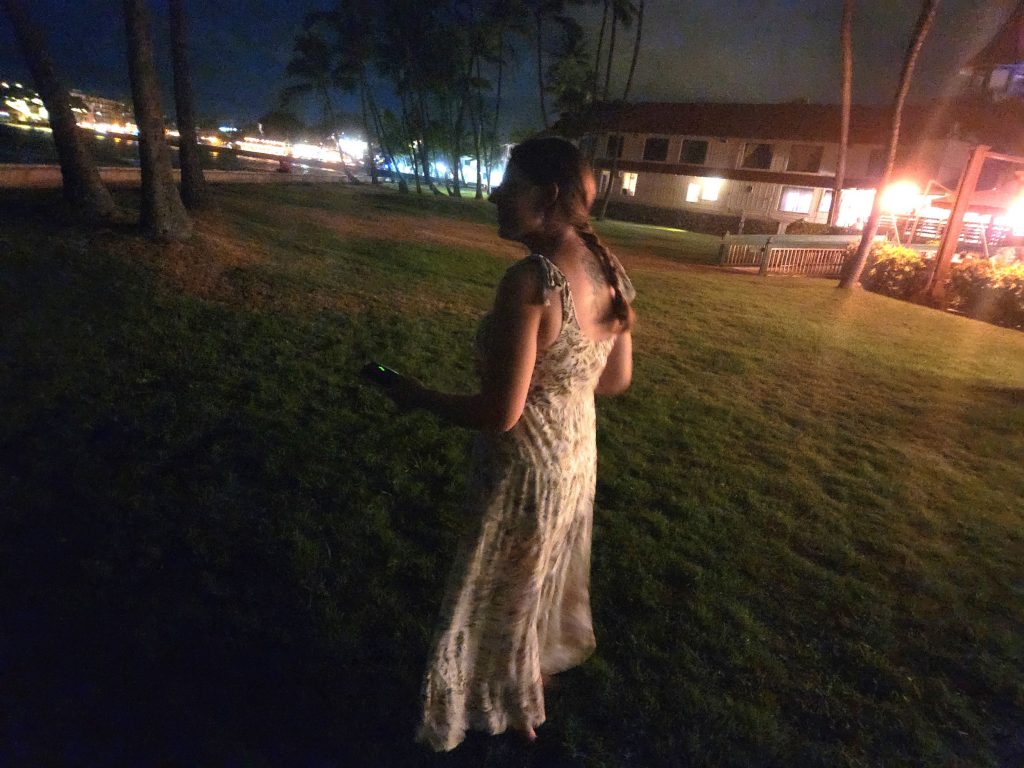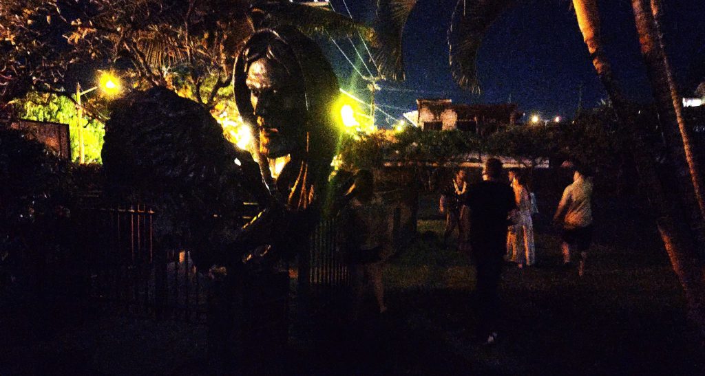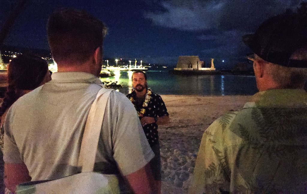 Behind the tour group, it was quiet at the historic Ahu‘ena Heiau, the religious temple that served the king inside his royal compound Kamakahonu that spanned Kailua Bay, as Royer called out to seemingly nothing in the dark.