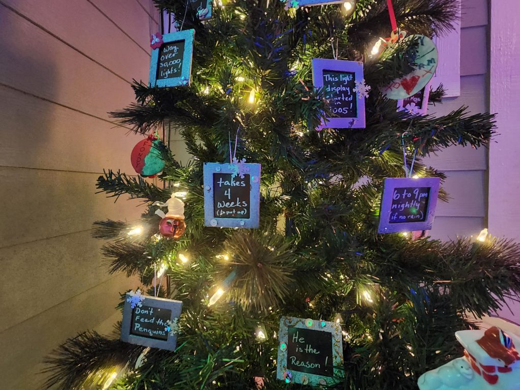 Kids — big and small — even have a chance to be a part of the decorating crew. Just use the light mixer attached to the big Christmas tree in the front yard to change its festive hue. You can also check out the FAQ tree by the front door to learn all about the displays, lights and other decor.