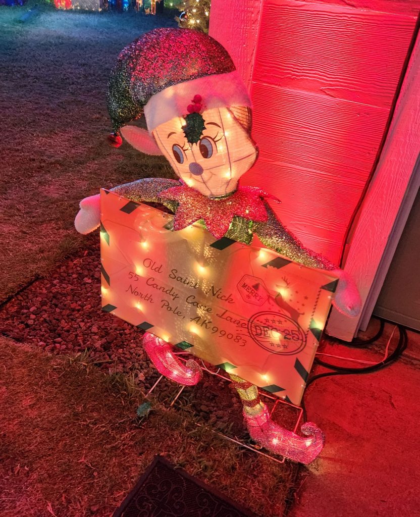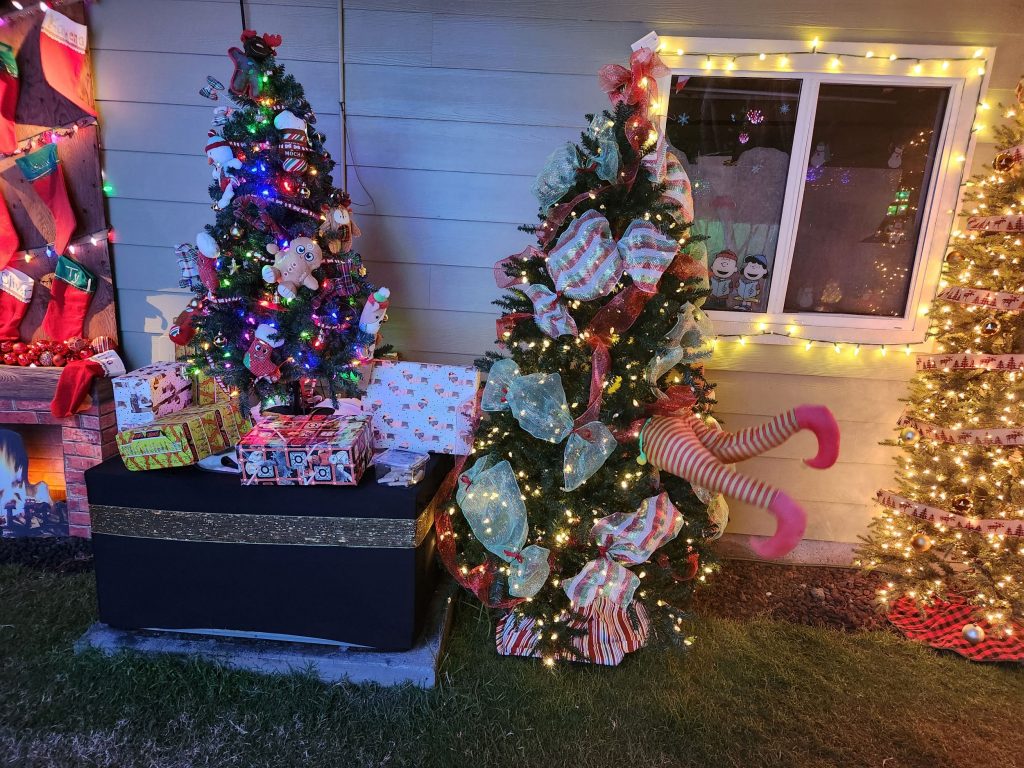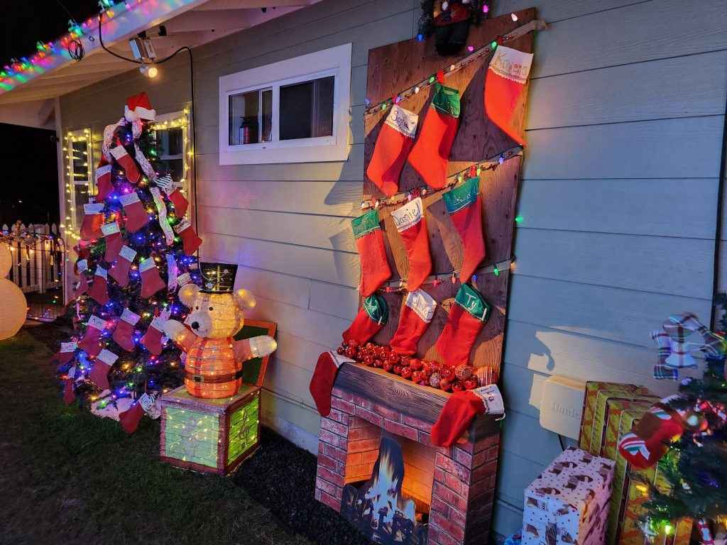 Special stockings are hung on a tree and chimney in the back, personalized by neighbors and family friends for children they know to unpack. There’s also a dog-themed tree, complete with toys and treats for furry friends and a remembrance tree where messages from visitors to their loved ones who’ve passed are penned.