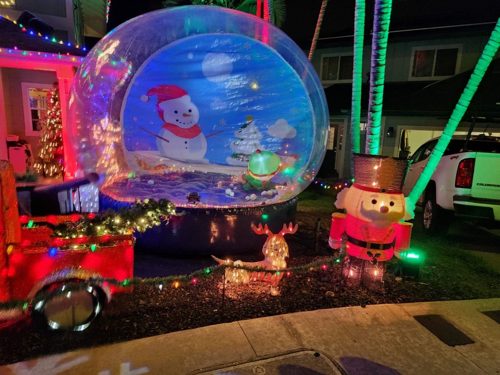 There also are Christmas trees aplenty, including one created with light strings towering 23 feet high, and a blow-up snow globe that entices keiki to come and play. They might even find a gift inside. No matter where you look, there’s something festive and shiny, from snowmen, nutcrackers and trains to gift boxes and a Roomba ice skating Snoopy.