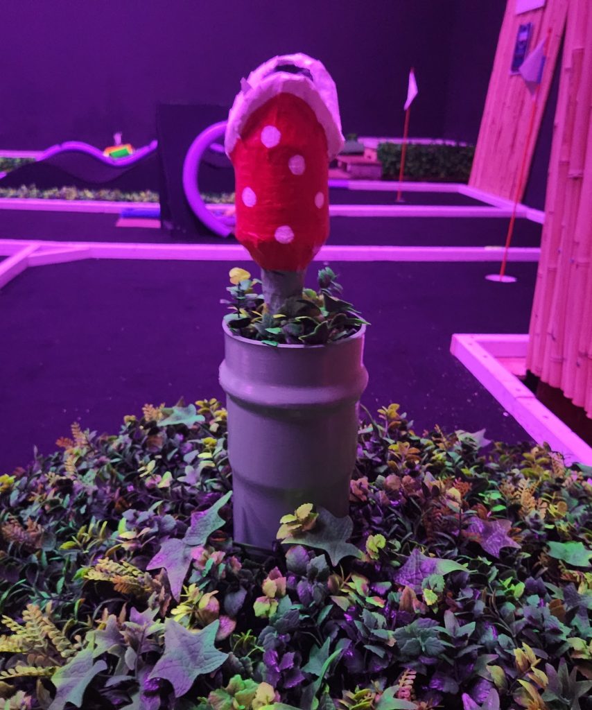 There’s also a Super Mario Bros. hole, complete with a piranha plant, gold coins, Princess Peach, Bowser and plenty of green pipes to explore, and golfers can hit their balls through Mr. Potato Head’s legs for a straight shot to the cup at another hole.