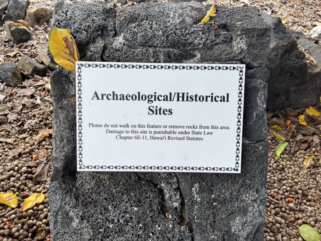 The area makai of the new parking lot is an archaeological preservation area, which is a historic site that is protected by state law. The public is advised to always stay within the provided pathways and to never move rocks, take rocks or otherwise damage features in this area.