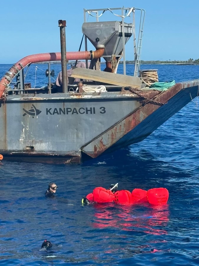 Body Glove donated two boats, crew and lift bags. Blue Ocean Mariculture offered crew, crane ops, and landing craft for tires and offloading. Kona Honu Divers donated tanks and Kohala Divers donated regulators to the operation.
