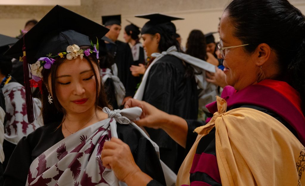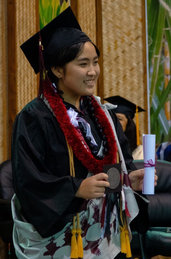 A strong thunderstorm and flash flooding nearly led to the cancellation of the May 10 ceremony for the college’s Manono campus at the Edith Kanaka‘ole Multi-Purpose Stadium in Hilo. But in typical Hilo fashion, the sun emerged just in time to shine on the 155 graduates in attendance.