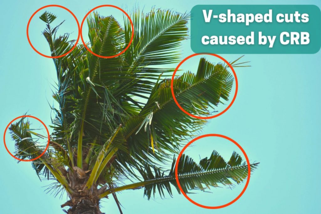 Adult beetles, as their name suggests, prefer coconut palms along with royal, date and fan palms. They feed on the growing spear of palm trees using their horns and spiny legs to dig into the crown, causing significant and potentially fatal damage. That damage also can leave the tree susceptible to disease.