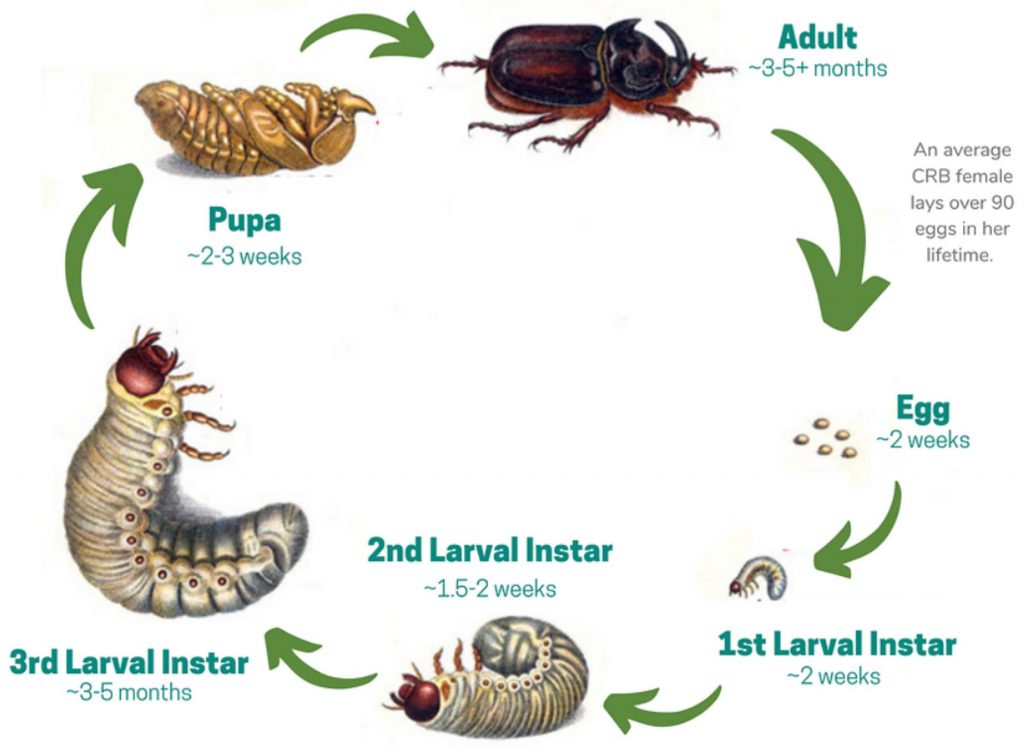 That means it is possible, albeit a short window, that three generations of coconut rhinoceros beetles could be reproducing at the same time.