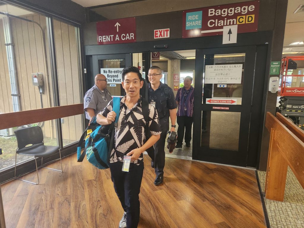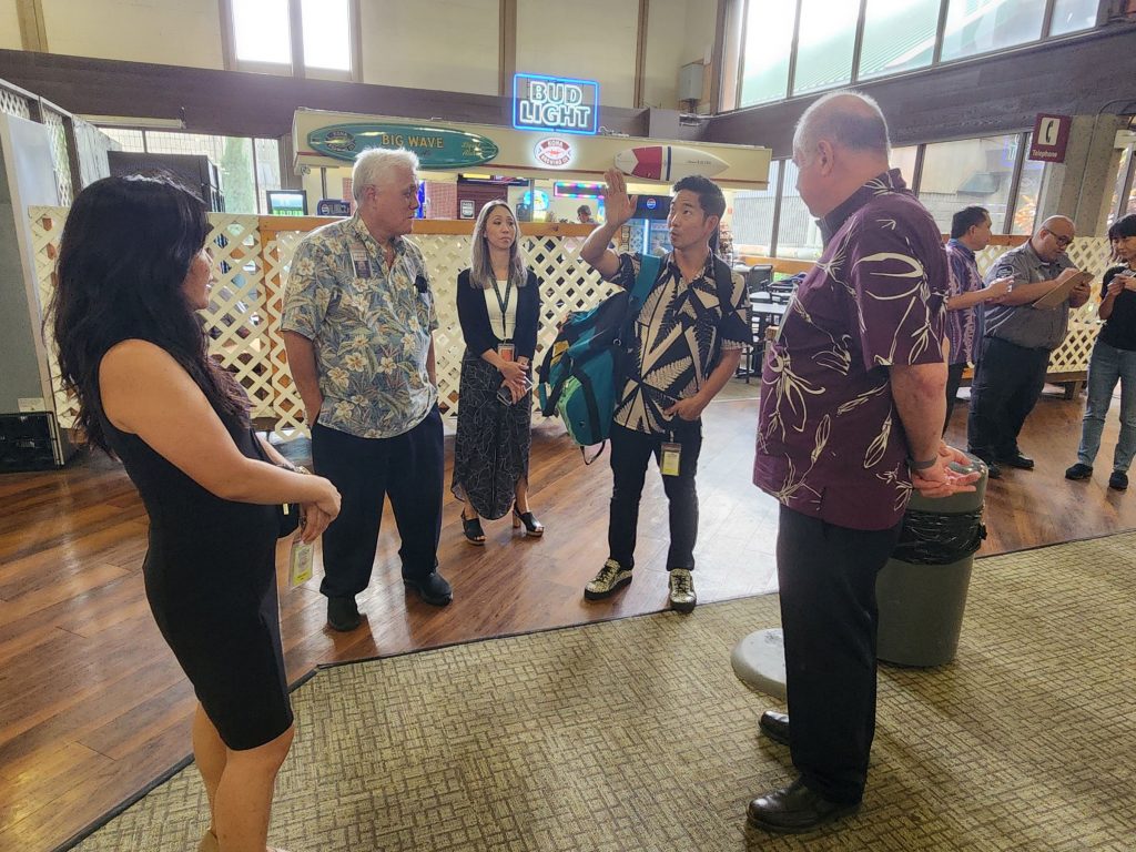 Roth and an entourage including Hawai‘i County Managing Director Deanna Sako, Hawai‘i Island Airports Division District Manager Chauncey Wong Yuen and the three members of Abstract Collab, among others, visited Hilo International Airport last week to view the murals and learn more about the multimedia project.