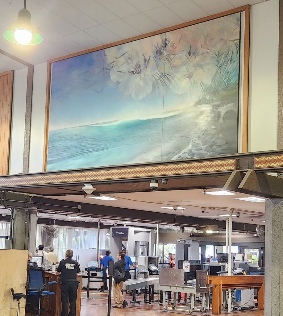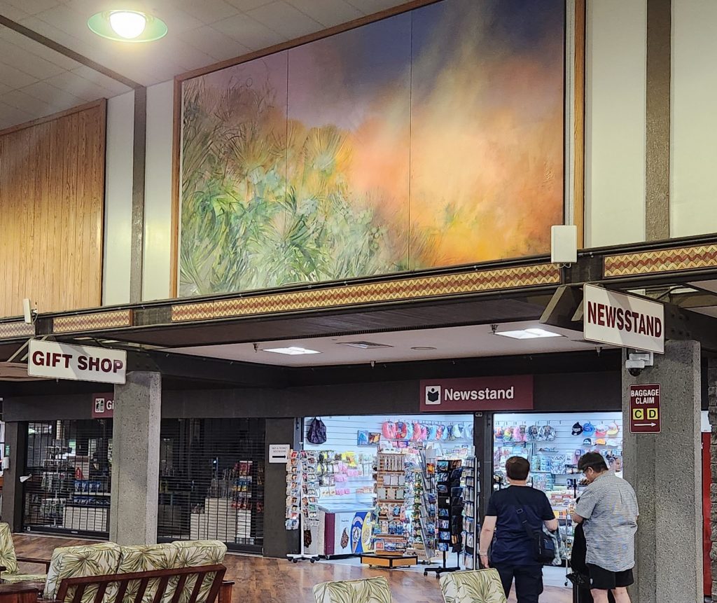 Five 18-by-11-foot original murals depicting different locations around the Big Island on oil painted canvasses have been installed for the past 2 years in the airport waiting area right after getting through the TSA checkpoint, above the gift shop, newsstand, restrooms, service animal relief stations and exits.