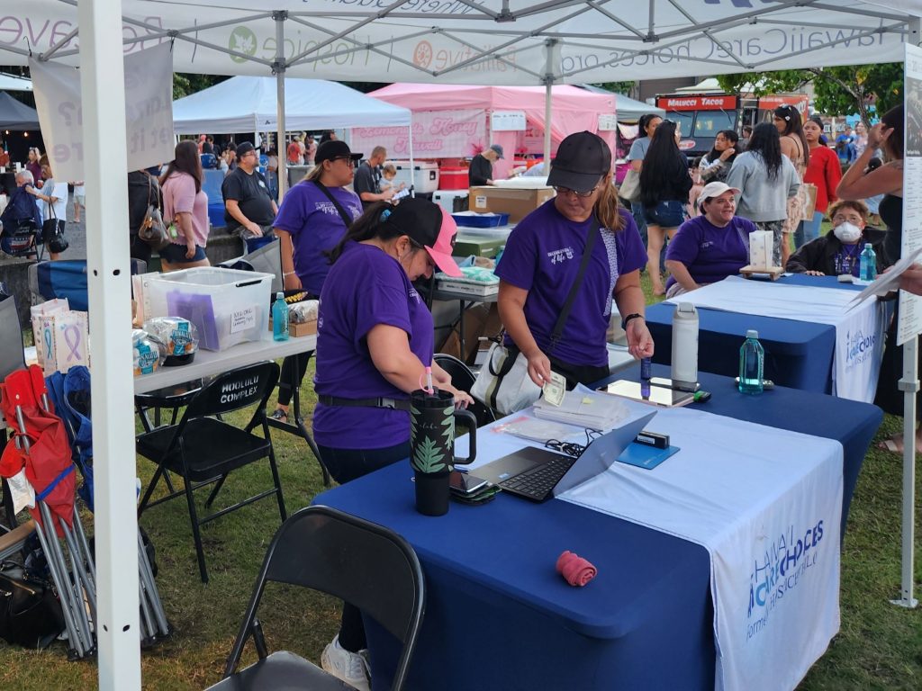 • Workers man the Hawai‘i Care Choices booth Sunday during the 20th annual Celebration of Life at Reeds Bay Beach Park in Hilo. (Photo by Nathan Christophel/Big Island Now)