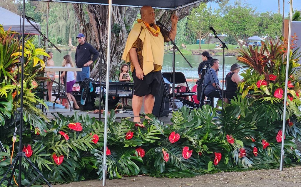 • A kumu offers words of faith prior to the lantern float Sunday during the 20th annual Celebration of Life at Reeds Bay Beach Park in Hilo (Photo by Nathan Christophel/Big Island Now)