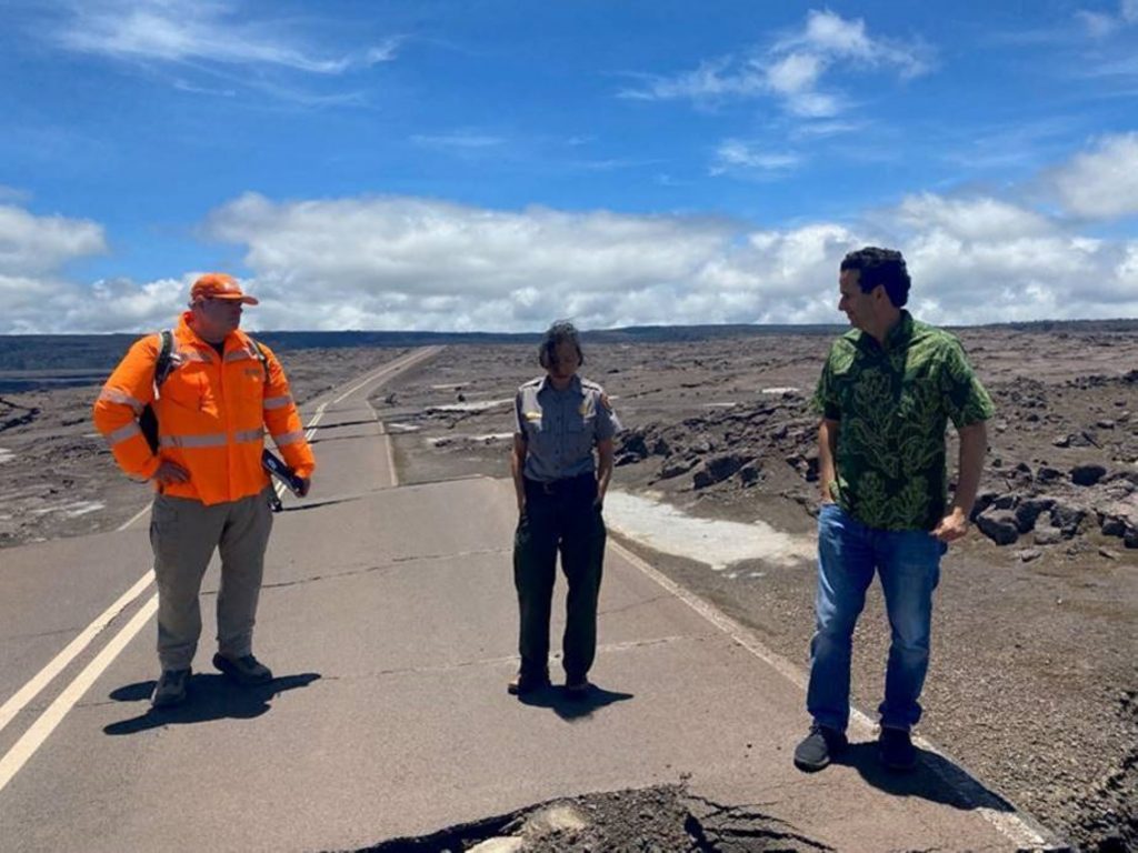 At Hawai‘i Volcanoes National Park, Schatz toured the damage to roads and buildings following the 2018 Kīlauea eruption and was briefed by park staff about the repairs being made using federal funding Schatz helped deliver.