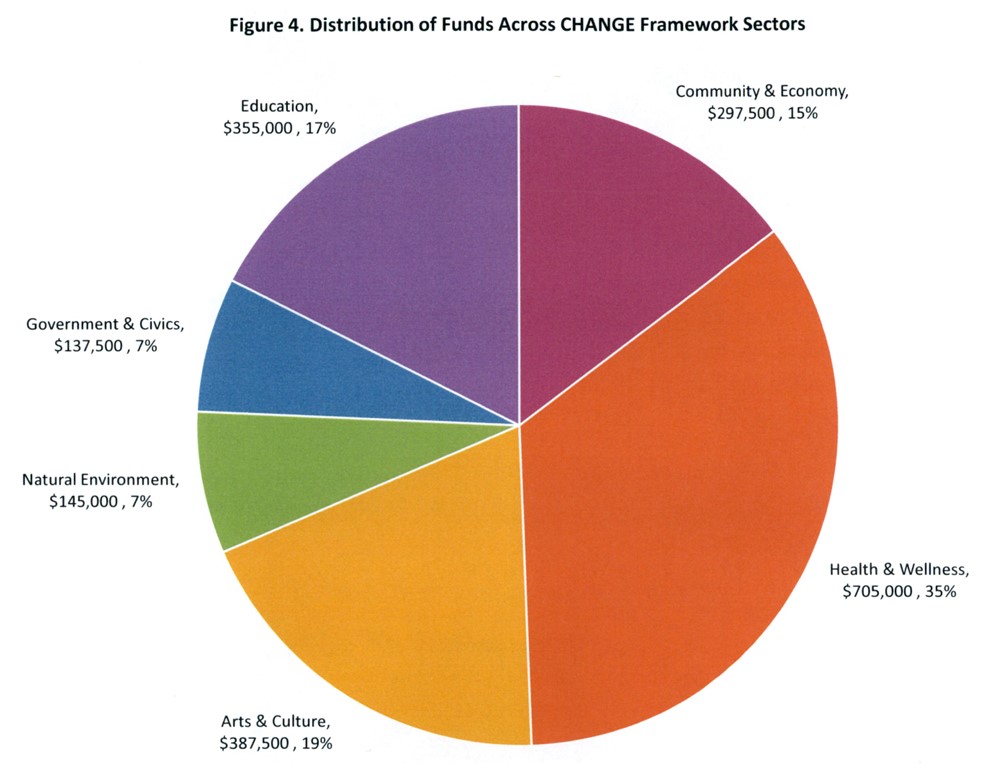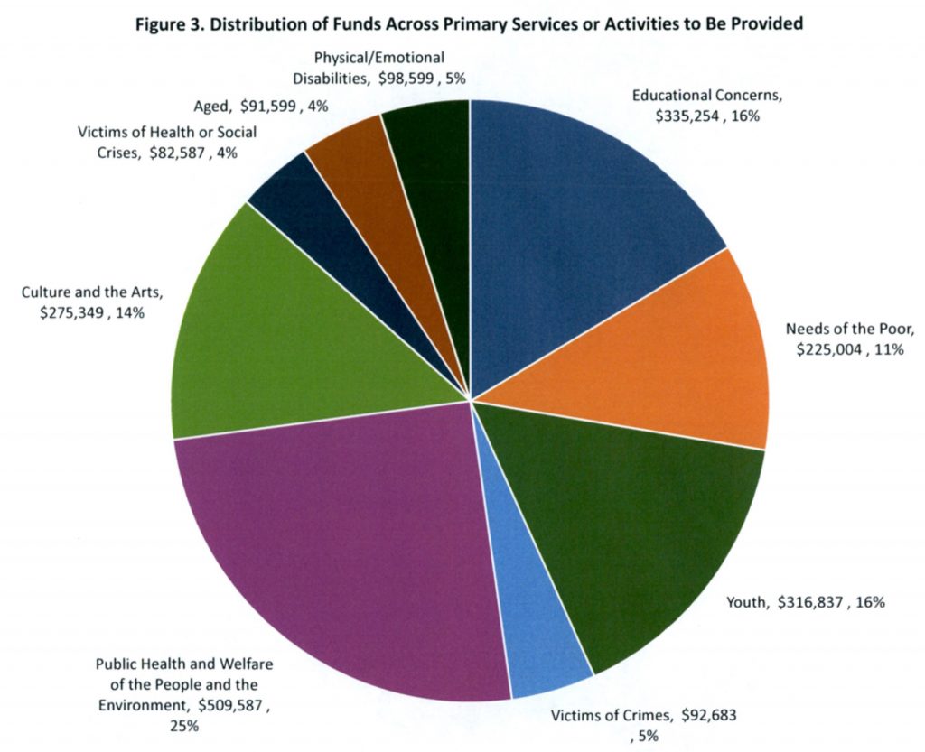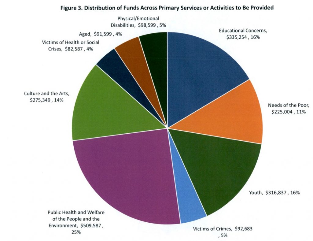 A quarter of the total funds awarded, $509,587, will be used for public health and welfare of people and the environment. Another $335,254 is going to educational concerns and $316,837 will be used by organizations for youth programs. Culture and arts programs get $275,349 of the total and $225,004 will go to needs of the poor.