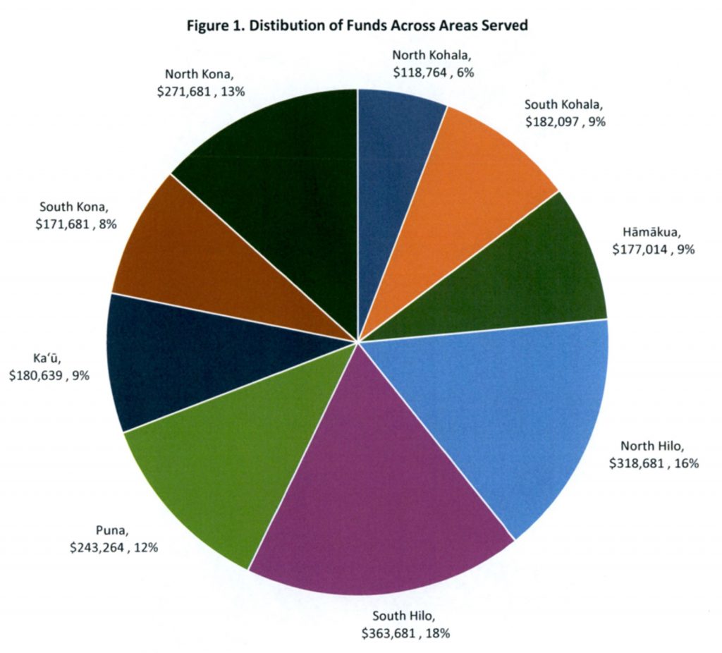 South Hilo programs were awarded the most of the $2,027,500 at $363,681, or 18%. Projects in North Hilo got the second-most with $318,681, or 16%, followed by North Kona programs receiving the third-most at $271,681, or 13%, and Puna projects getting the fourth-most with $243,264, or 12% of the total.