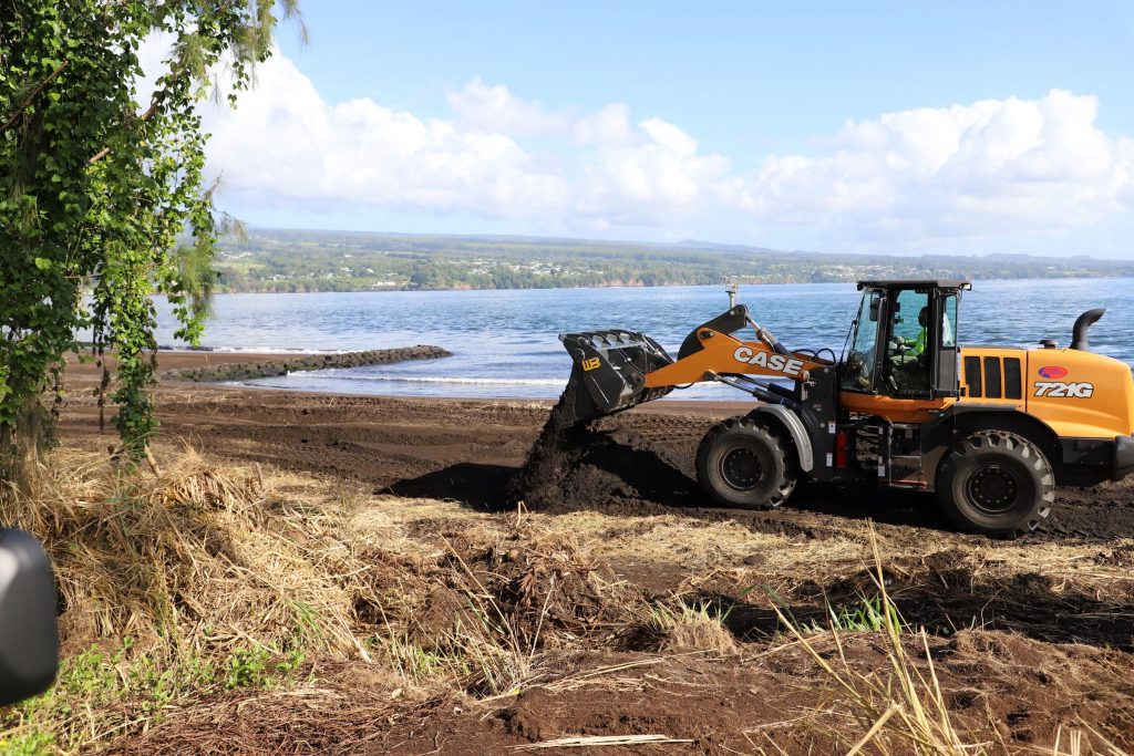 • A shore-based excavator and front-end loader began this week moving dark brown soil from the Wailoa Small Boat Harbor basin and spreading it along the shoreline in Hilo. (Photo courtesy of the Hawai‘i Department of Land and Natural Resources)