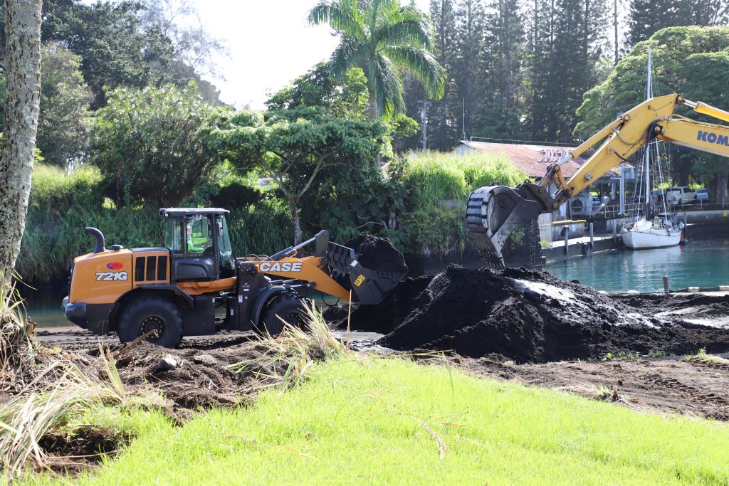 A shore-based excavator and front-end loader began this week moving dark brown soil from the Wailoa Small Boat Harbor basin and spreading it along the shoreline in Hilo. (Photo courtesy of the Hawai‘i Department of Land and Natural Resources)