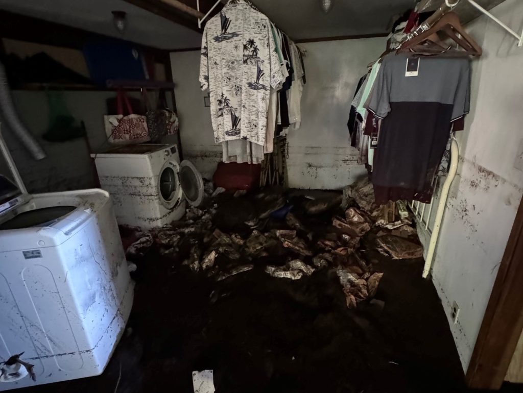 Sherry Mastandrea and her son Jacob Satterwhite’s home, known as the Hobbit House and near Ha‘ao Springs in Wai‘ōhinu, was damaged by flash flood waters that rushed into the kitchen and back room, leaving 2 feet of mud and boulders covering the floor.