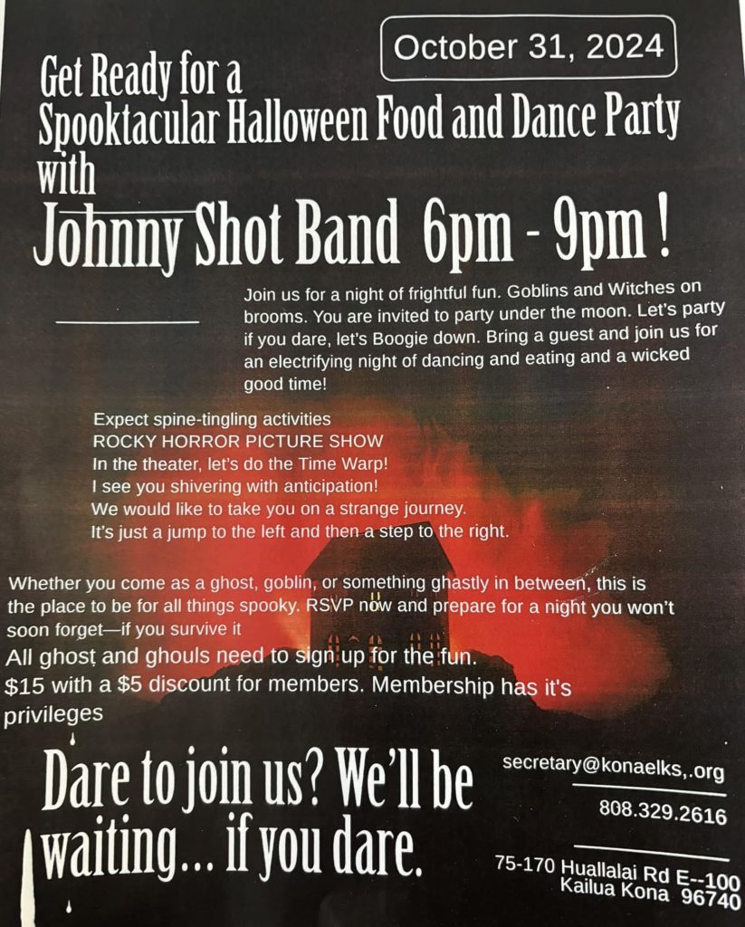Kona Elks invites community members to join them, if they dare, for a night of frightful fun under the moon. Bring a guest and boogie down with Johnny Shot Band. Expect spine-tingling activities, too, including “The Rocky Horror Picture Show” taking audiences on the “Time Warp” again in the theater. Whether you come as a ghost, goblin or something ghastly in between, it’s sure to be a wicked good time. RSVP to attend. Cost: $15; members receive a $5 discount. To RSVP: Email to secretary@konaelks.org.