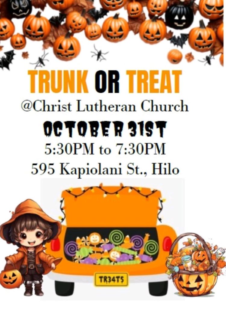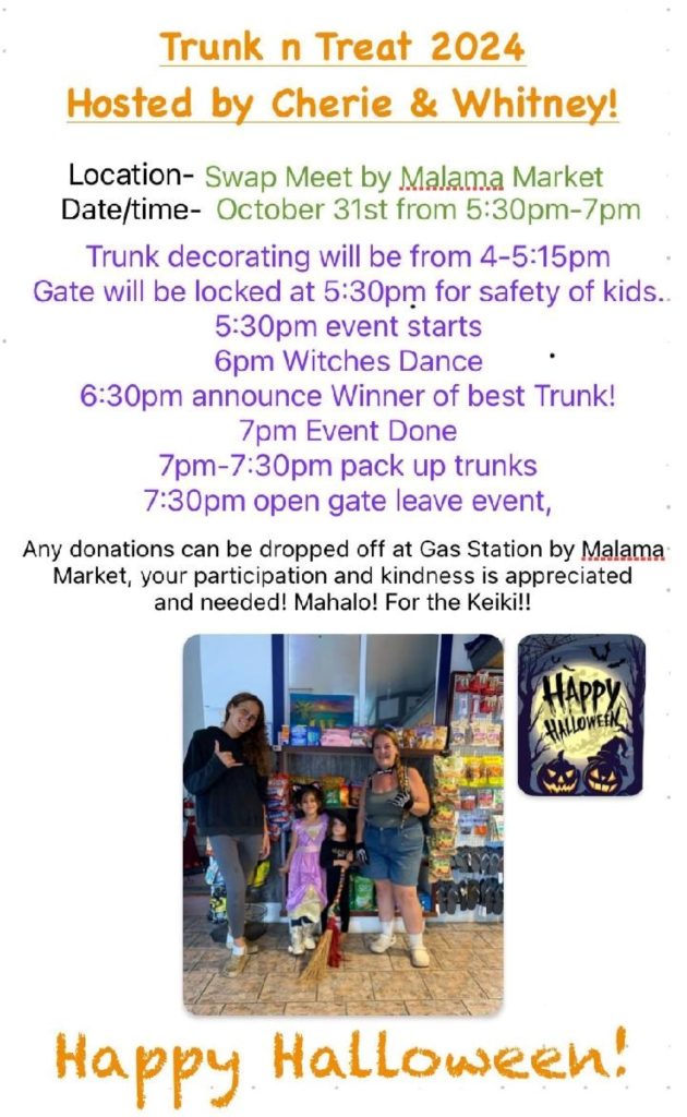 It will be a whole lot of Halloween fun that will include collecting treats, a “Witches Dance” and a Best Trunk contest. Trunk decorating is from 4 to 5:15 p.m. Gate will be locked for the duration of the event for safety of the kids. Anyone who wants to donate can drop items off at the gas station by Mālama Market; your participation and kindness are appreciated and needed.