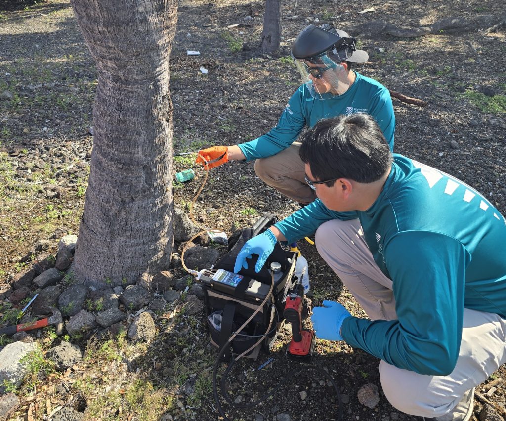 Crews on April 7-8 began work at Natural Energy Laboratory of Hawai‘i, treating 58 trees via crown treatments, with about 14 trees treated via injections because of their close proximity to water.