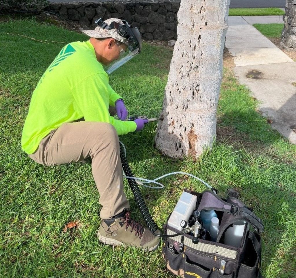 The team treated a total of 38 trees Jan. 14 in the Waikōloa area via crown treatments and 24 were treated via an injection system, which provides systemic protection against coconut rhinoceros beetles.