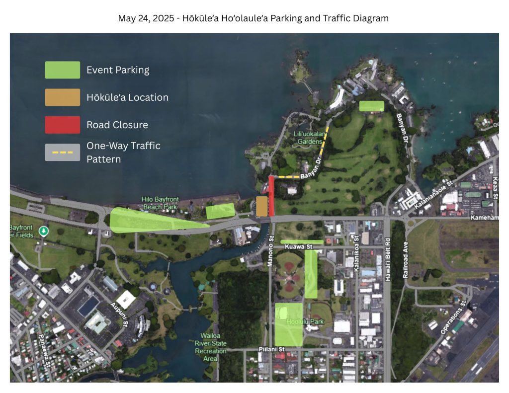 There will be a temporary one-way traffic pattern along a portion of Banyan Drive this Saturday to accommodate “Hilo’s Hōkūleʻa Ho’olaulea” event this Saturday.
