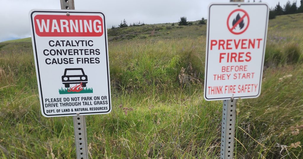 • Signs on the north slopes of Mauna Kea, which were experiencing extreme drought as of June 12, urge people to prevent fires and warn them about catalytic converters causing fires and parking on tall grass. (Photo Courtesy: Hawai‘i Department of Land and Natural Resources)